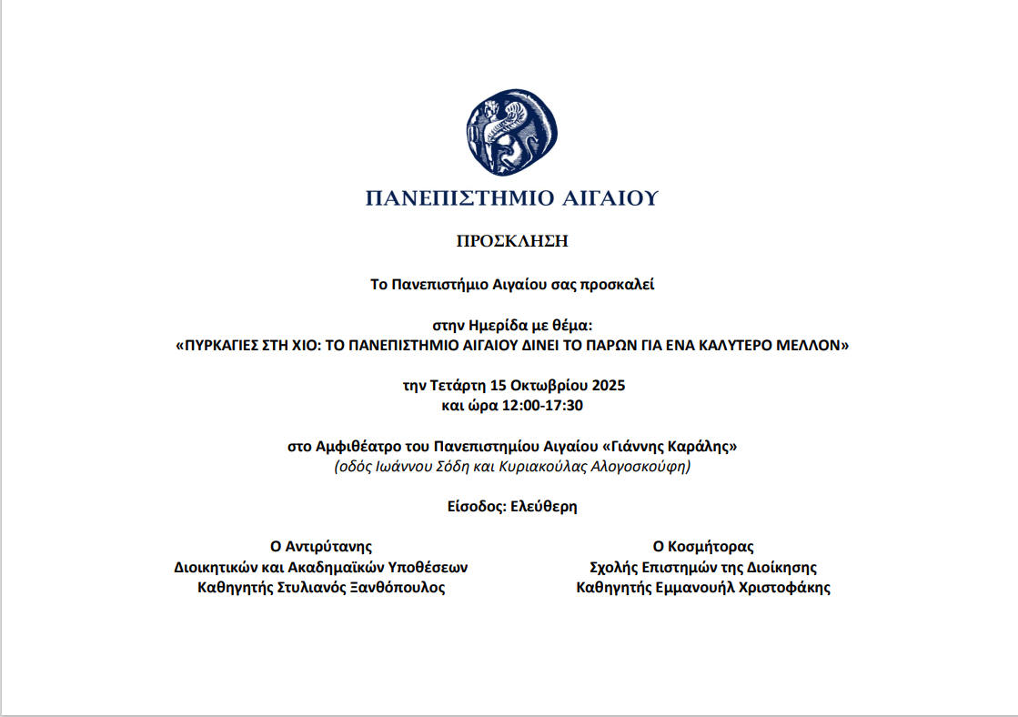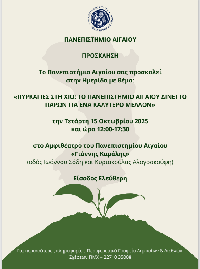 Το Πανεπιστήμιο Αιγαίου αναλογιζόμενο την τεράστια ζημιά που προκάλεσαν, για ακόμα μια φορά, οι πρόσφατες καταστροφικές πυρκαγιές στη Χίο, διοργανώνει ενημερωτική–επιστημονική ημερίδα με τίτλο «Πυρκαγιές στη Χίο: Το Πανεπιστήμιο Αιγαίου δίνει το παρών για ένα καλύτερο μέλλον».